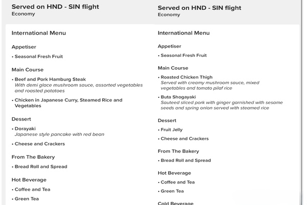 こちらの画面はご予約情報を連携頂いた際に見る事ができる【 機内食 】のメニュー表ですが、搭乗前に提供される内容を確認する事が出来ます。