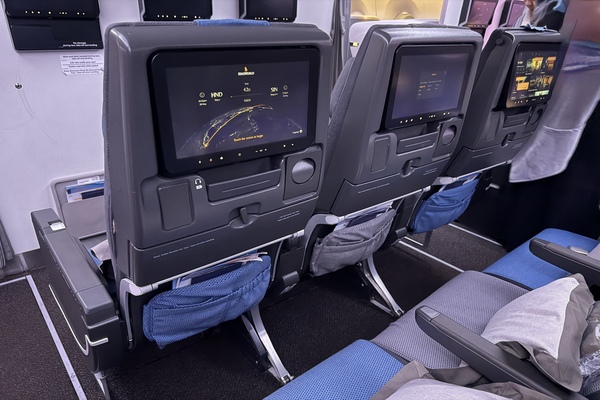 ・座席には一人一台モニターが完備されており、小物用の収納スペースもございます。