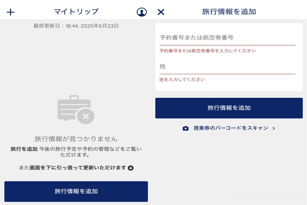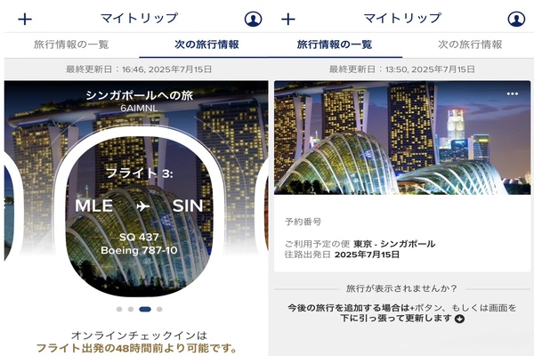 ・シンガポール航空のアプリをダウンロード頂き【 マイトリップ 】を開くと旅行情報を追加という画面が開きます。
