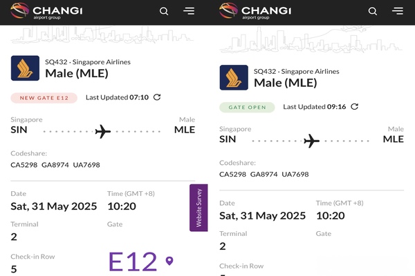 シンガポール - モルディブ間に関しては搭乗口(搭乗ゲート)が決定していないので、チャンギ国際空港到着後電光掲示板を見て頂き移動します。