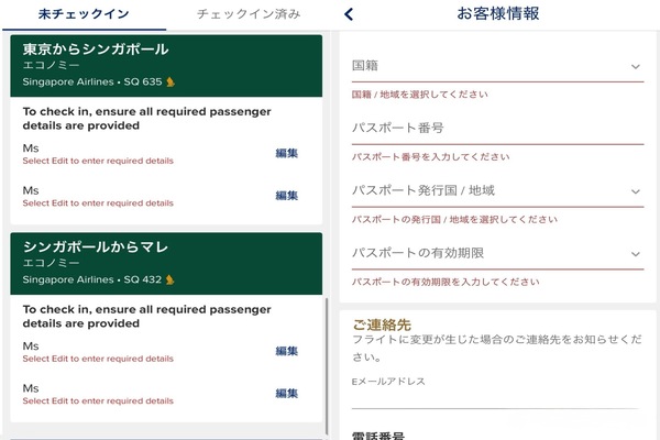 ご自身のパスポート番号や有効期限・当日の連絡先などの入力をご搭乗者様分ご自身でご対応ください。