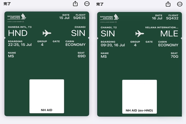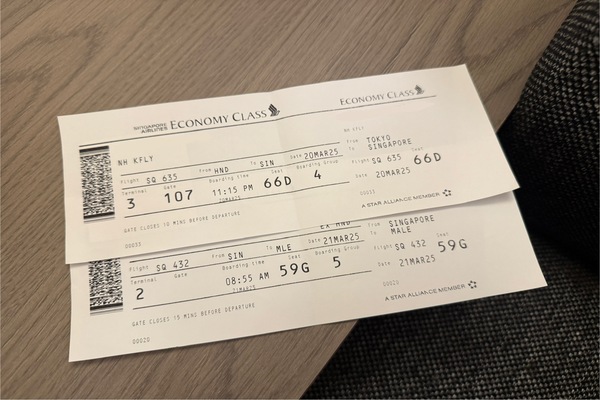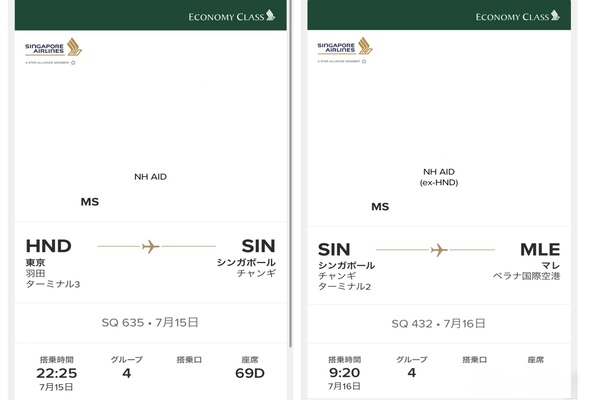・搭乗券は往路に2枚分(東京 - シンガポール / シンガポール - モルディブ間)が発券されます。