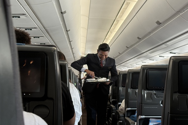 機内食はスナックを一通り配り終わってからの提供となりますので、離陸後1-2時間前後を目安としてお考えください。