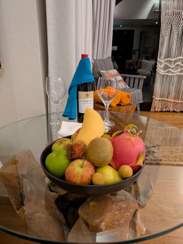 お部屋の端には、備え付けのソファベッドが。小さな丸テーブルには、ウェルカムフルーツ・ワインが置かれていました°˖✧