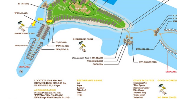 ココ ボドゥヒティはお部屋からのシュノーケリングでも十分楽しめますが、ホテルスタッフによるとMAPの黄色の矢印の通りにヴィラ郡がある桟橋根本のビーチからのアクセスで海へ潜り、お部屋に戻るのがおすすめだそうです。