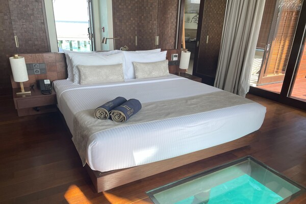 ラグジュアリー感のある落ち着いた雰囲気のお部屋。水上のお部屋はどのカテゴリーでもガラス床が付いています。