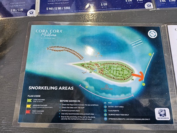 お部屋前はラグーン(=シュノーケリングに向かない海)となりますが、リゾートの一部にあるシュノーケリングスポットがとても良いです(マップ赤丸部分)!