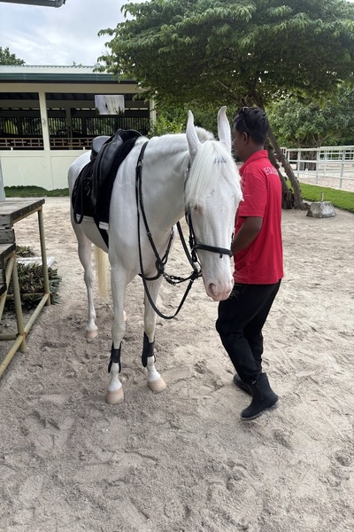 説明が終わった後、すぐさま馬に乗ります。モルディブで馬に乗るのは初めてですので、少し緊張、、
