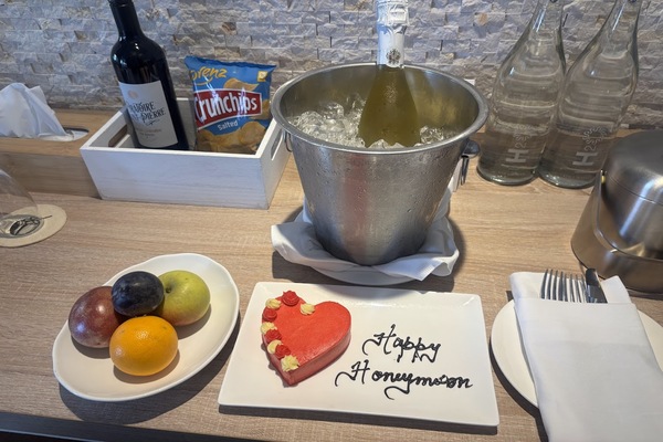 ハネムーン特典のケーキとワインも置いてあります^^