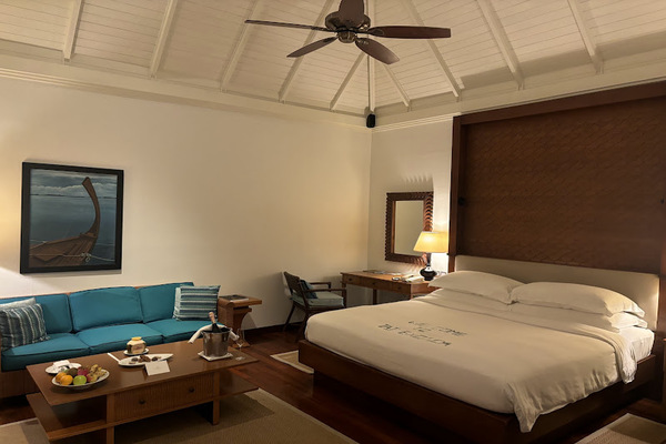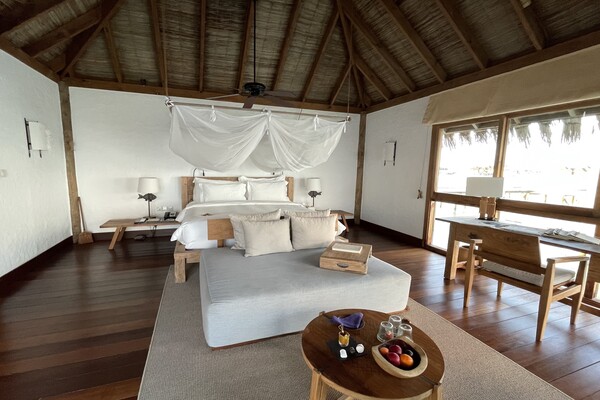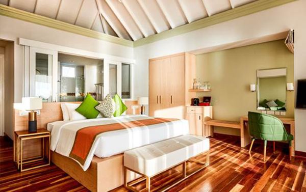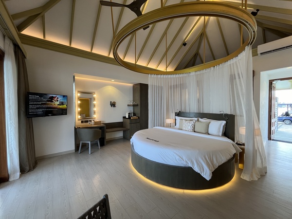 お部屋はオレンジを基調にした温かみのある色合い。オルヴェリには水上のお部屋の種類が複数ございますが、おすすめなのはドリームランド島に位置するグランドと名前の付くお部屋。他と比べてお部屋面積も広いほか、オルヴェリは老舗ホテルですが、こちらのカテゴリーのお部屋は2019年に新設されたため、古さの心配も必要ありません!