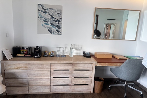 ベッドの横にはワークデスクと、お水がコーヒーマシン等が置いてあります。