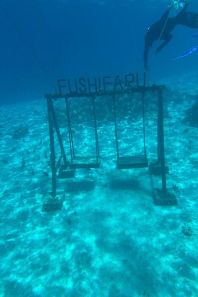 フシファルモルディブは遠浅のリゾートなので基本的にはお魚は少ないですが、海中公園といって海に潜るとブランコや三輪車などがありました。ブランコは結構水深がありますので、気合いを入れて潜らなければいけません。。