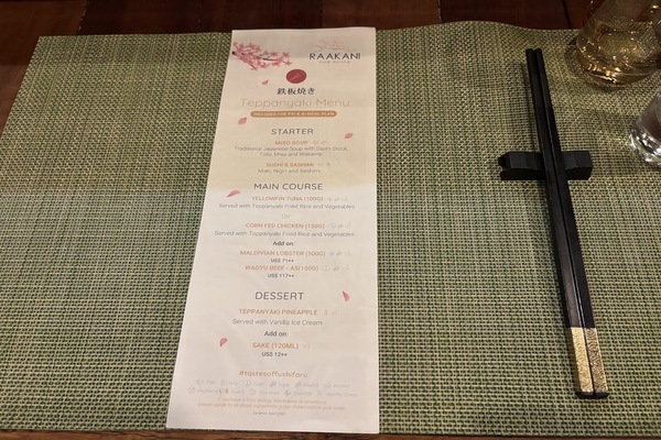 併設されている鉄板焼きにて今回は特別にディナーをいただきました。オールインクルーシブプランでは$40お支払いいただくことでご利用可能です。