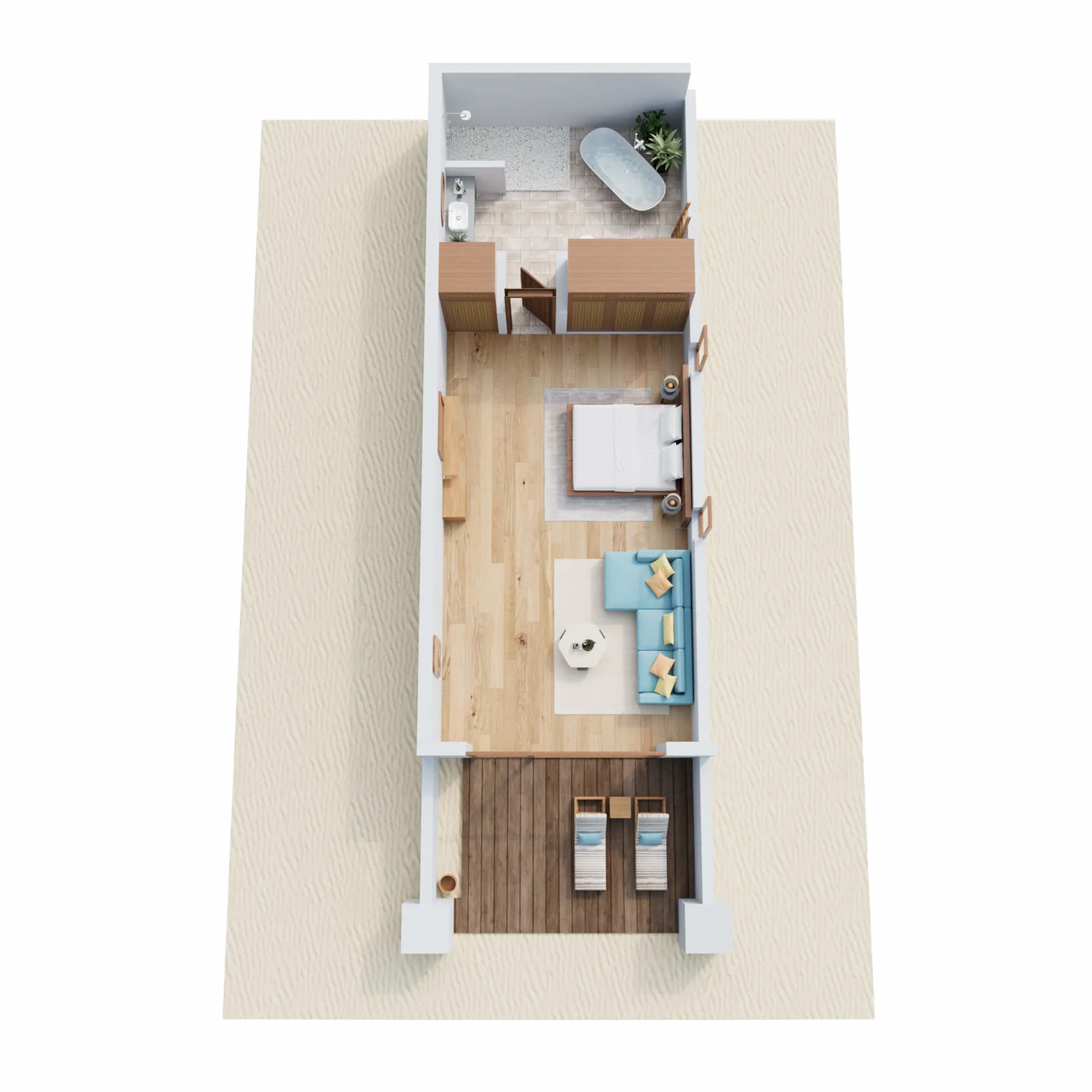 デラックスヴィラは広々としたリビングスペースを備え、海の景色をお楽しみいただけます。静かな朝はビーチデッキで日光浴をし、午後は涼しいリビングルームでゆったりとお過ごしください。
