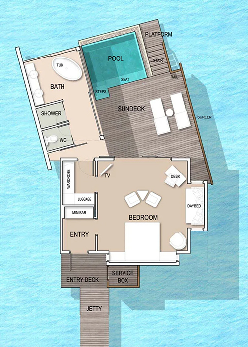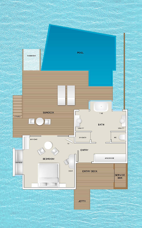 サンデッキとプールがより大きくなり、広々とした空間が魅力のお部屋。人気の水上ハンモックも付いています。4室しかないのでご予約は特にお早めに!