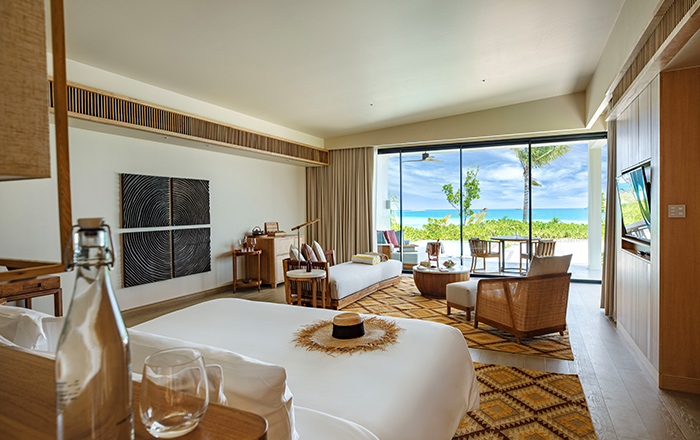 横長の造りで広々したヴィラをお楽しみください。落ち着いた色味のお部屋で、美しい海を眺めながらゆっくりとお過ごしいただけます。お部屋の向きはサンライズ・サンセット側に分かれています。