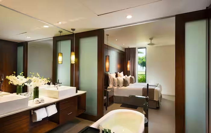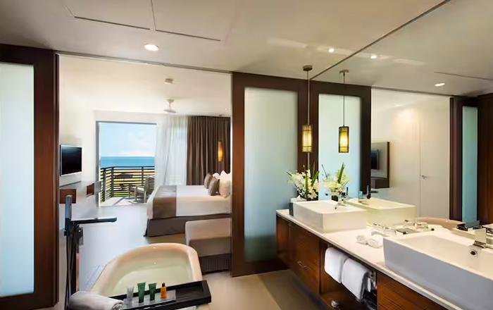 キッチン、バスタブ付きが嬉しい少し広めのお部屋。内装は落ち着いた色合いで、ラグジュアリーな雰囲気です。ガーデンビュー、ビーチフロントの2つのタイプからご選択可能です。