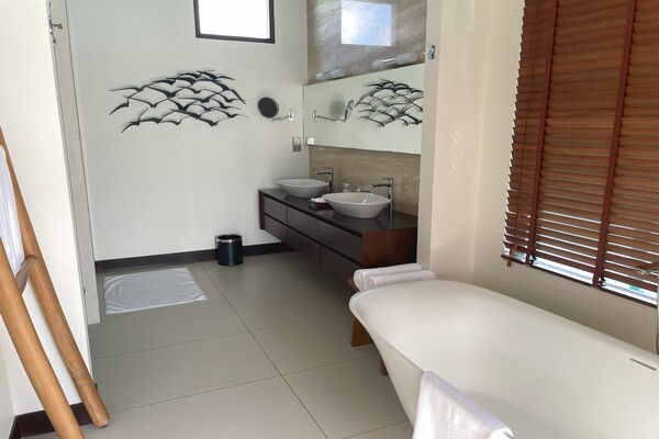 バスタブのエリアとデッキエリアは繋がっており、行き来が可能です。洗面台も2つございますので、広々と利用頂けます。