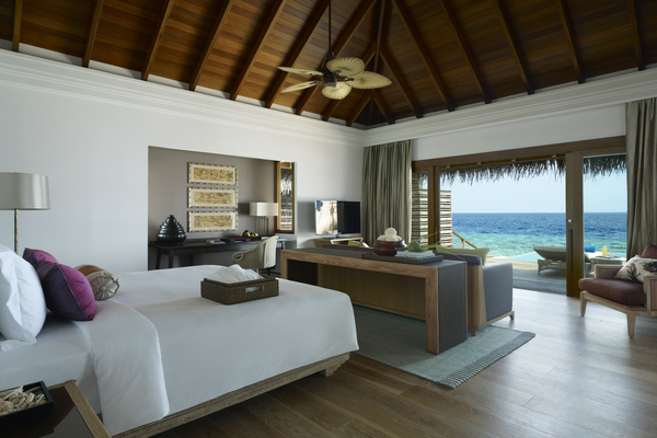 テラスからは水上ヴィラの特権である壮大なエメラルドグリーンの美しい海を眺めることができます。バスルームには海の景色を望むバスタブが付いており、お部屋の内装はシンプル且つモダンな造りとなっております。