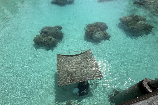 海に面したビーチではなく、湖のような区切りが施されており、こちらの箇所に珊瑚の植え付けを行っております。ホテル内で一番魚が存在する場所と言われており、浅瀬では足が付く深さ・深い場所は最大2m前後の深さとの事でした。