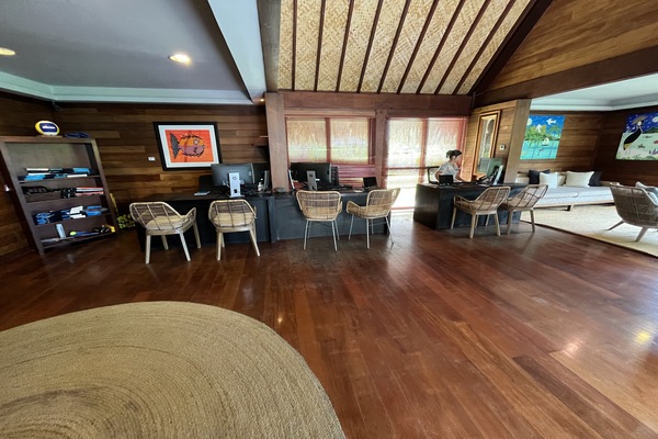 到着後、こちらの場所でチェックインやチェックアウトを行います。右奥にはチェックイン前&チェックアウト後にも利用できるシャワー室がございます。