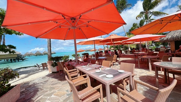 ビーチサイドのオープンエア席からは、サンセットを眺めながら食事を楽しめます。また、姉妹ホテル「インターコンチネンタル ボラボラ リゾート&タラソスパ」への無料シャトルボートを利用すれば、より多彩なダイニングも楽しめます。