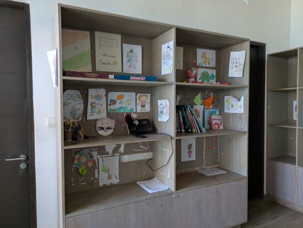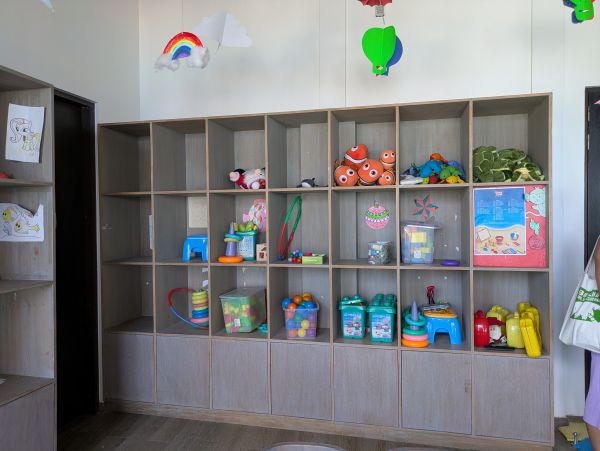 室内スペースには、子どもたちの描いた絵やぬいぐるみが飾られていました**