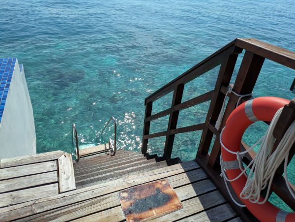 今回私はプール付きリーフ水上ヴィラからシュノーケリングを行いましたが、ドロップオフ(お魚が多く見れるポイント)がかなり近かったです。
