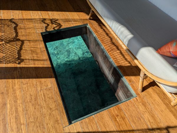 ベッドの側には、上から海が眺められるガラス床が設置されています。