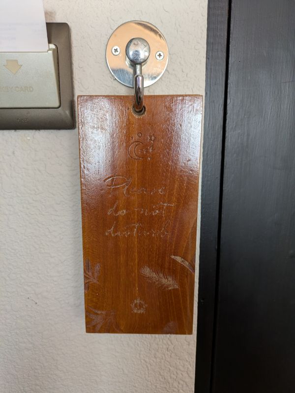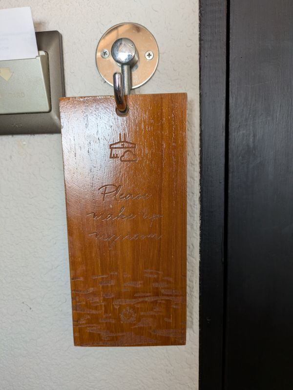 また、こちらのホテルの場合、入室可否はドアにかける木札で示します。