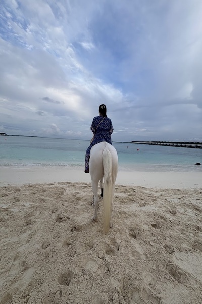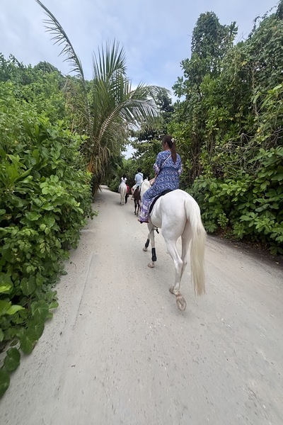 説明が終わった後、すぐさま馬に乗ります。モルディブで馬に乗るのは初めてですので、少し緊張、、