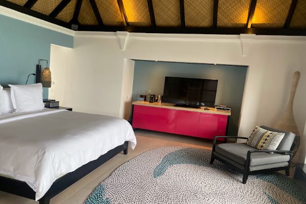 お部屋はオレンジを基調にした温かみのある色合い。オルヴェリには水上のお部屋の種類が複数ございますが、おすすめなのはドリームランド島に位置するグランドと名前の付くお部屋。他と比べてお部屋面積も広いほか、オルヴェリは老舗ホテルですが、こちらのカテゴリーのお部屋は2019年に新設されたため、古さの心配も必要ありません!