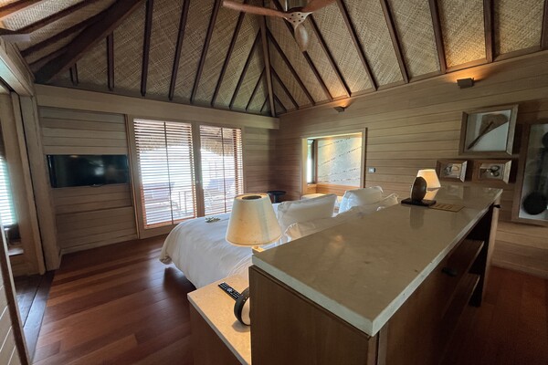 ・ビーチバンガローに関しては少し手狭ではありますが、(ビーチバンガロー:55㎡/水上スイート:93㎡)お部屋内はタヒチらしいナチュラルな雰囲気です。