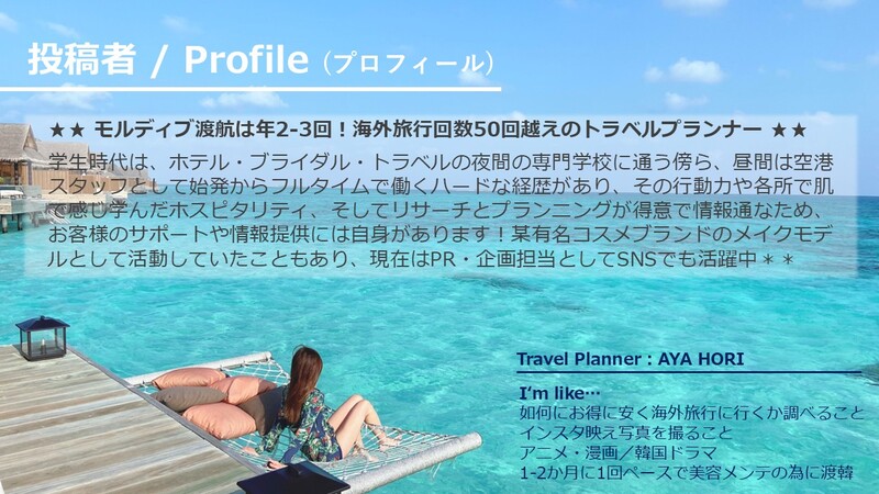 トラベルプランナーの「堀 杏耶」です。