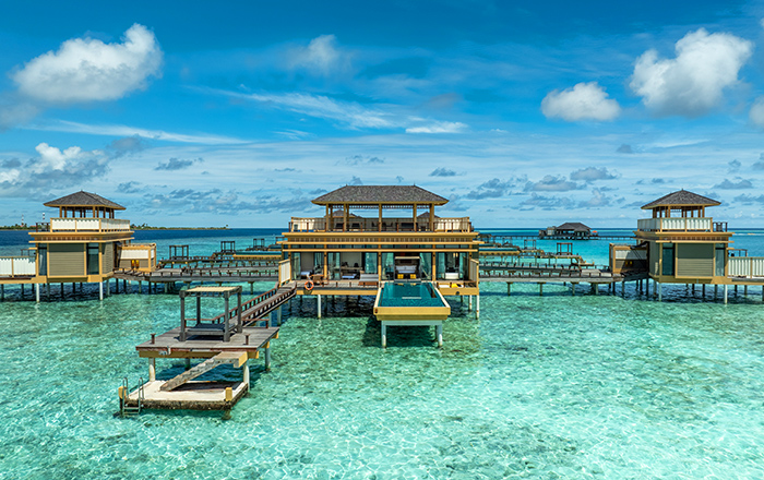 まだまだ手つかずのダール環礁にある広大なプライベートラグーンが広がるリゾートです。このリゾートの特徴は遠浅の広大なラグーンがあり景色が非常に美しいことです。反面、ハウスリーフでの魚影はあまり濃くはありません。最大のポイントは、本島と船で行き来する「インオーシャンヴィラ」という水上ヴィラでプライベート感が抜群!水上ヴィラ以外の本島のお部屋に宿泊の方は「インオーシャンヴィラ」の方には行くことも出来ない徹底ぶり。本当の意味での ”海に浮かぶ部屋(水上ヴィラ)” が楽しめるのが魅力的です。