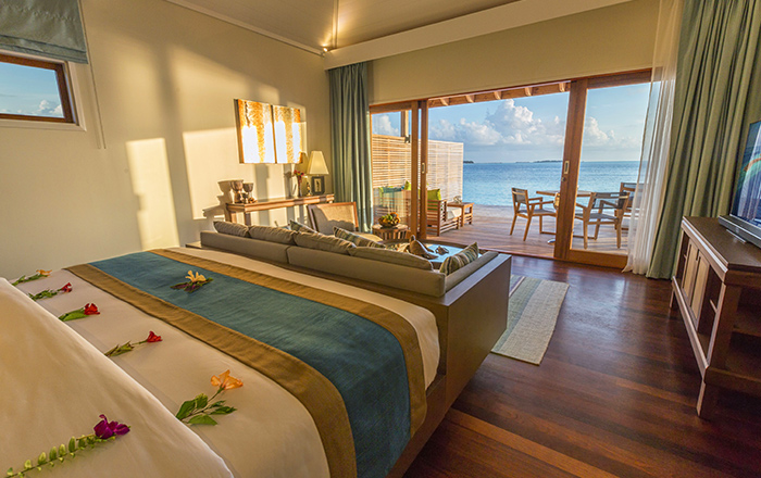 オーシャンヴィラと同じ作りのお部屋です。このお部屋には唯一、バスタブ (アウトバス) と水上ハンモックが付いており、さらにサンセット側に位置しております。