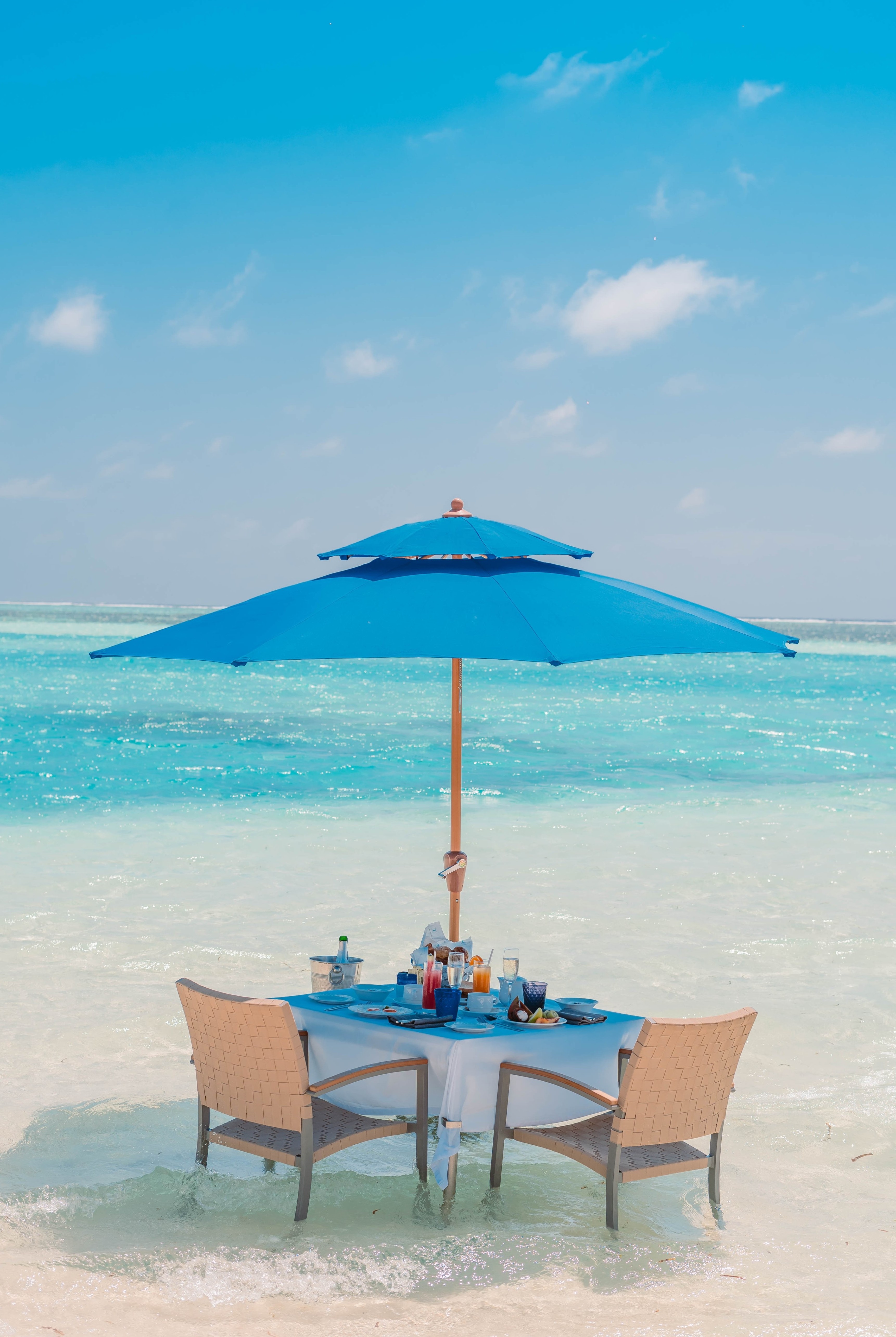 *ラグーンブレックファーストは海の上にテーブルがセットアップ&朝食が用意され、浅瀬なので洋服を着たままお食事OK!