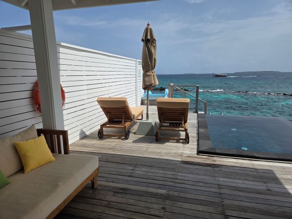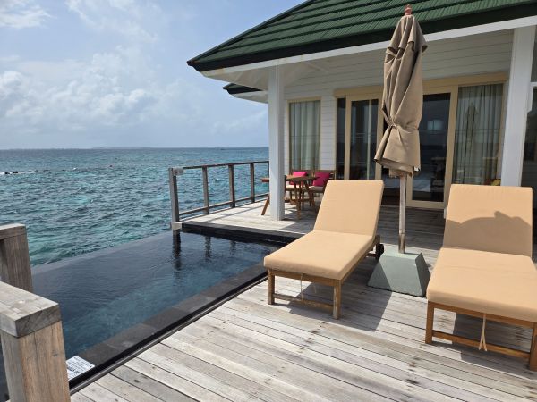 リクエスト通り、一番端の眺め最高のお部屋に滞在させていただきました。視界に何も阻むものがなかったため、雄大な海と静かな環境、水上飛行機の離陸なども間近で見ることができ、シュノーケリングではカラフルな多くの魚に会えたのですが、滞在中ずっと風が強かったため、コテージの周りの潮流が強く、子どもたちがスライダーを滑れないという予想外のこともありました。スライダーを滑るためにここに来たのに意味がないと泣く娘を見て、ホテルのスタッフの方に相談したところとても親切に対応してくださり、部屋を浜辺に近い場所に途中から代えてくださったのでそれからスライダーを滑ることができ、子どもたちも念願かなって大喜びでした!
